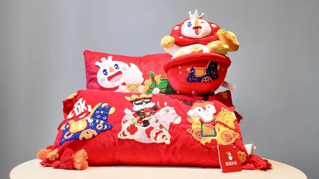 还有一长一短两个红色靠枕,色彩鲜艳,绒面材质软软乎乎,刺绣细节也格外用心,还原了礼盒封面的四个IP形象。窝在沙发里追剧时垫着,或是放在床头当装饰,都能让家里的年味悄悄升级。