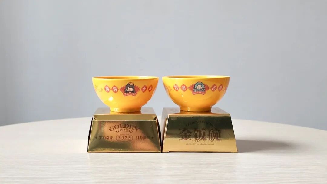 更让人惊喜的是,礼盒里还有两个压轴的“金饭碗”,碗壁上印着赵公明和妈祖的Q版头像,还刻着“碗满金满”、“吉星高照”的吉祥话,用这对金饭碗吃年夜饭,一定能讨个好彩头。这样能拿捏了氛围感的暴富礼盒,谁收到不喊一声绝!