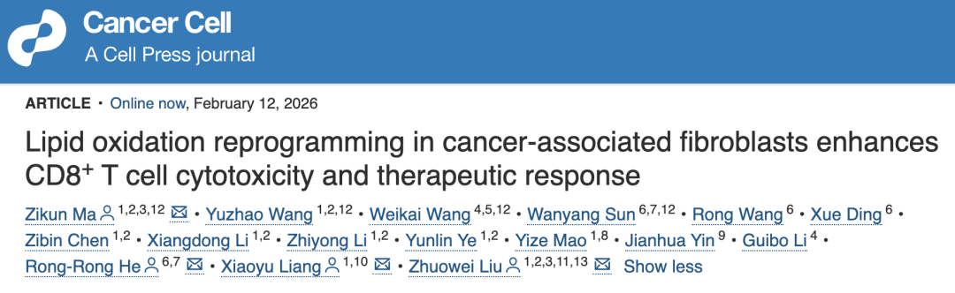 2026 年 2 月 12 日,中山大学肿瘤防治中心刘卓炜/马梓坤/梁晓雨团队联合暨南大学何蓉蓉团队,在 Cancer Cell 期刊发表题为:Lipid Oxidation Reprogramming in Cancer-Associated Fibroblasts Enhances CD8⁺ T-Cell Cytotoxicity and Therapeutic Response 的研究论文。