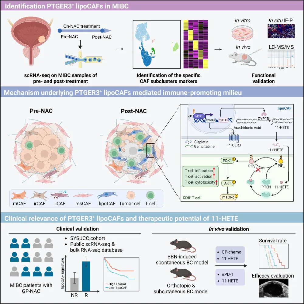 在这项最新研究中,研究团队通过整合单细胞转录组测序、氧脂组学分析以及人源化小鼠等模型,在对化疗敏感的膀胱癌组织中鉴定了一类以脂质代谢及脂质氧化显著增强为特征的 PTGER3+ CAF 亚群——lipo-CAF。