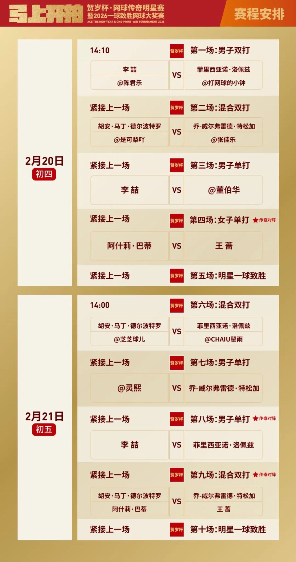 其中,贺岁杯·网球传奇明星赛将有6名网坛传奇选手与8名人气网球达人联袂出战,比赛安排在20日和21日两天。而2026一球致胜网球大奖赛则将有512名业余选手参赛,将在18日至21日进行。