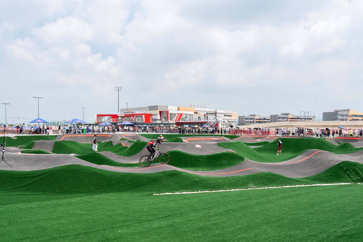 新建的这座乐享运动体育公园,除了儿童区还有赛事区。那是一片泵道场地,这条泵道可不简单——它是按照国际自行车联盟(UCI)的标准建设的。就在刚刚过去的几个月,2025中国泵道自行车联赛乳山站已在这里成功举办。