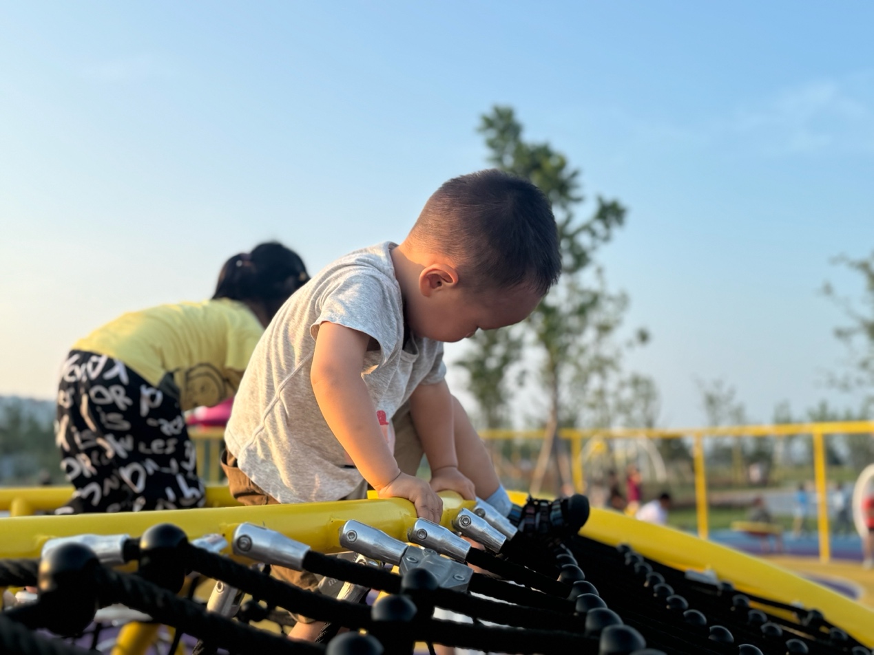 2025年夏天,孩子在乳山滨海新区新建的月亮湾休闲公园童趣乐园内攀爬