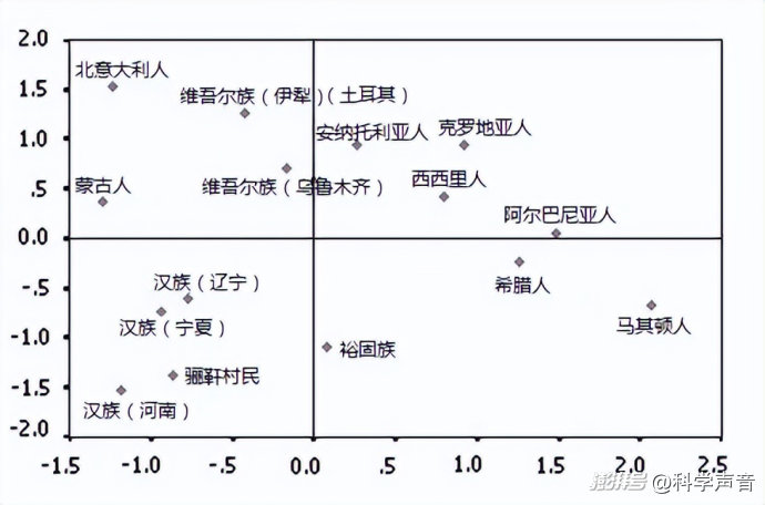 包括骊靬村民在内的15个欧亚大陆上的不同人群,基于Y染色体DNA的二维相似度结构分析,位置越靠近相似度越高