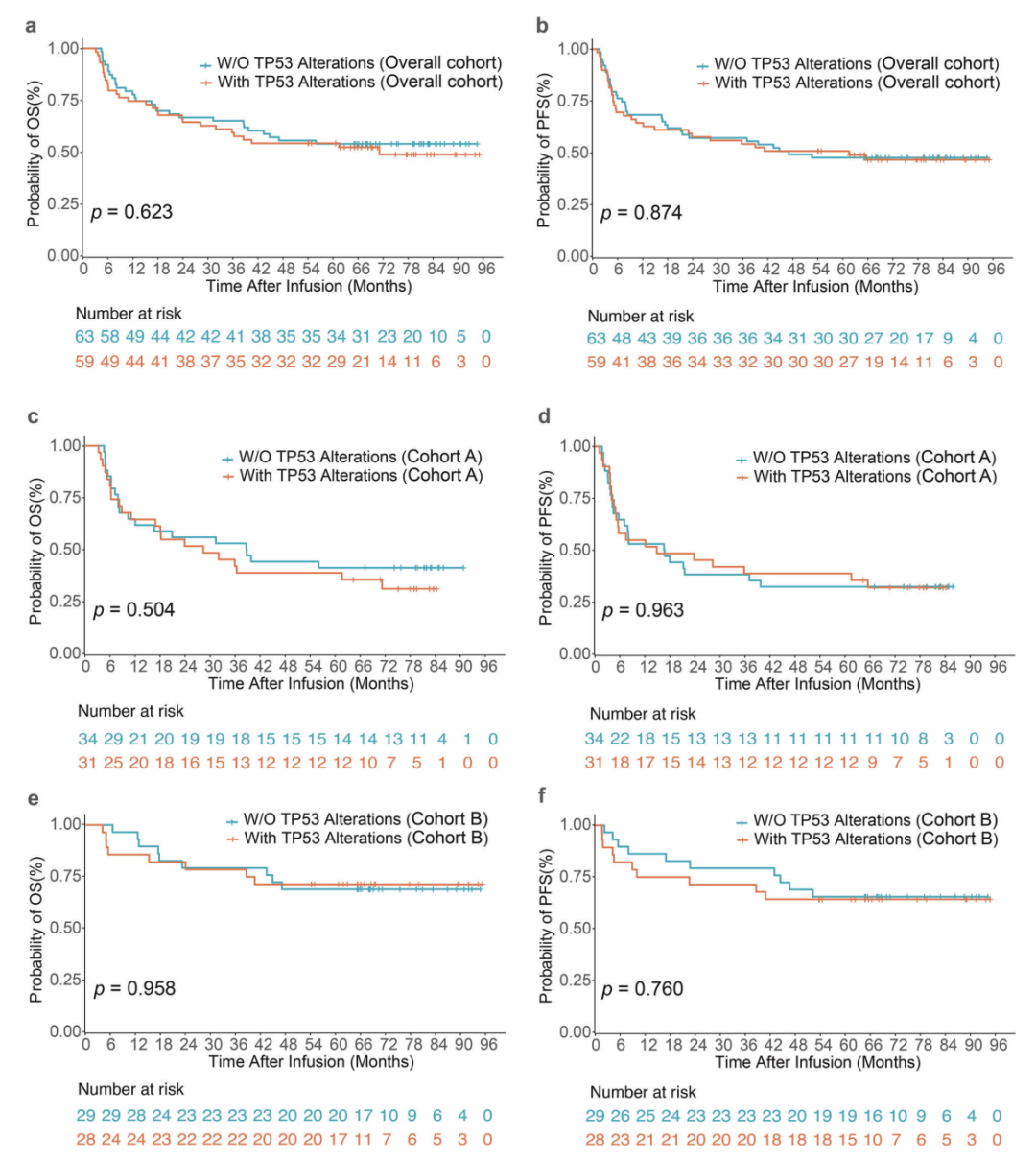 在这项最新研究中,研究团队报告了 122 例 r/r B-NHL 患者的长期随访结果(中位随访时间为 77.77 个月),这些患者接受了单独的双靶向 CD19/CD22 CAR-T 细胞疗法(A 组,n = 65)或在自体干细胞移植(ASCT)后接受双靶向 CD19/CD22 CAR-T 细胞疗法(B 组,n = 57)。其中有59 名患者(48.4%)中携带 TP53 基因突变。