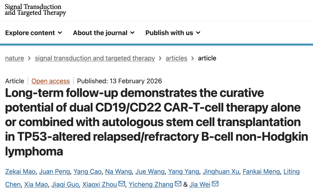 2026 年 2 月 13 日,华中科技大学同济医学院附属同济医院隗佳、张义成、周晓曦等,在 期刊发表了题为:Long-term follow-up demonstrates the curative potential of dual CD19/CD22 CAR-T-cell therapy alone or combined with autologous stem cell transplantation in TP53-altered relapsed/refractory B-cell non-Hodgkin lymphoma的研究论文。