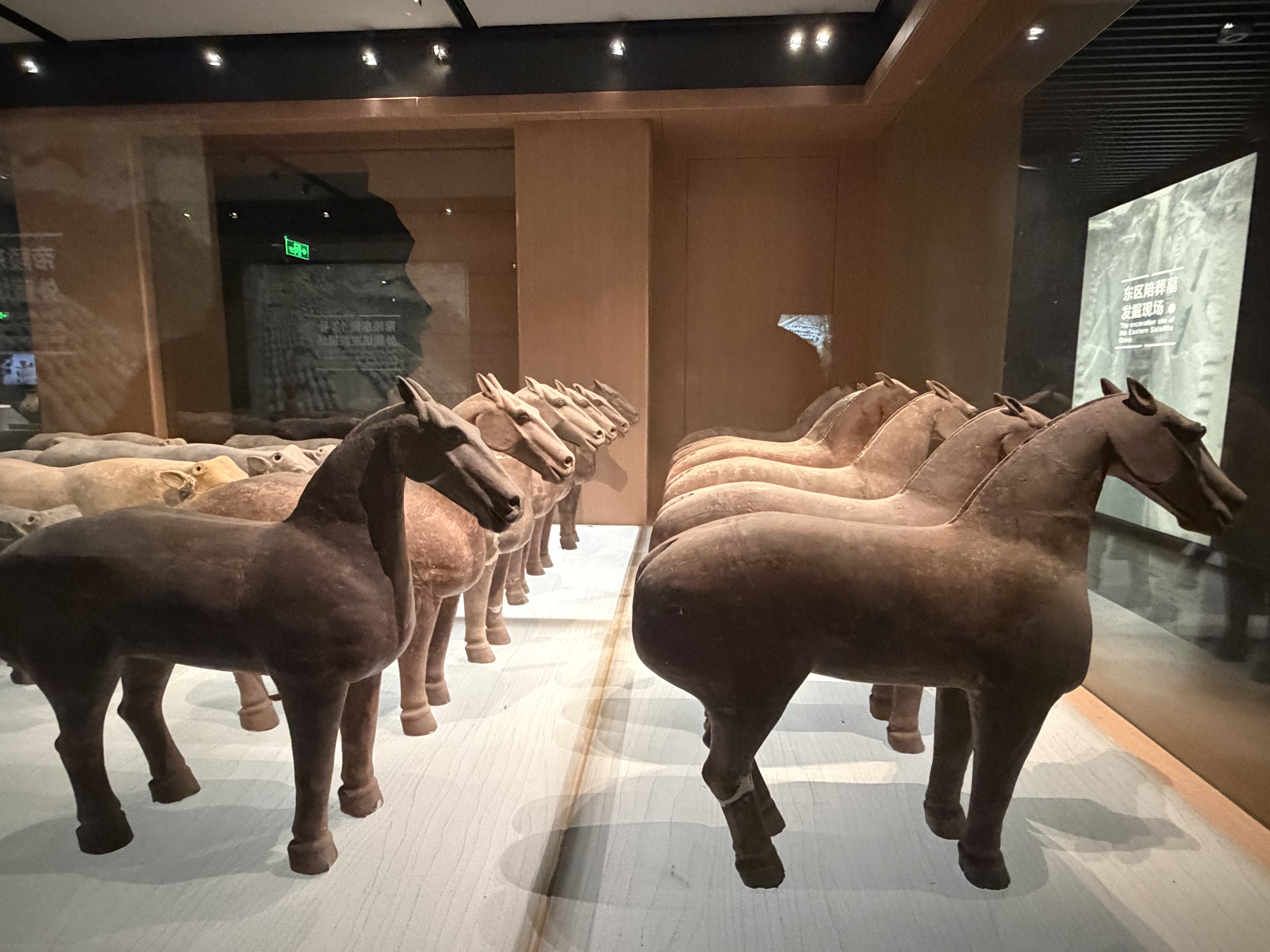 阳陵陪葬坑中的马俑,已发掘的约有数百件,散见于各个俑坑。阳陵博物院陈列厅展出的东区九号陪葬坑一号外藏坑的那一群马,有序排列,疏密得当,有意思的是,后面跟着的则是猪牛羊狗,再后面则是坛坛罐罐等——这些领头的马,显然是属于家常性的马,温驯,质朴,和善,且无一例外都是汉地本土马种的模样,尺寸不大,身高约四五十厘米,体长约五六十厘米。躯干粗壮,四肢短劲,头部方正,眼窝深陷却不锐利,多为直立状,神情沉稳内敛。与阳陵其他区域出土的马俑相比,这一群塑形更显规整,肌肉线条勾勒得恰到好处。