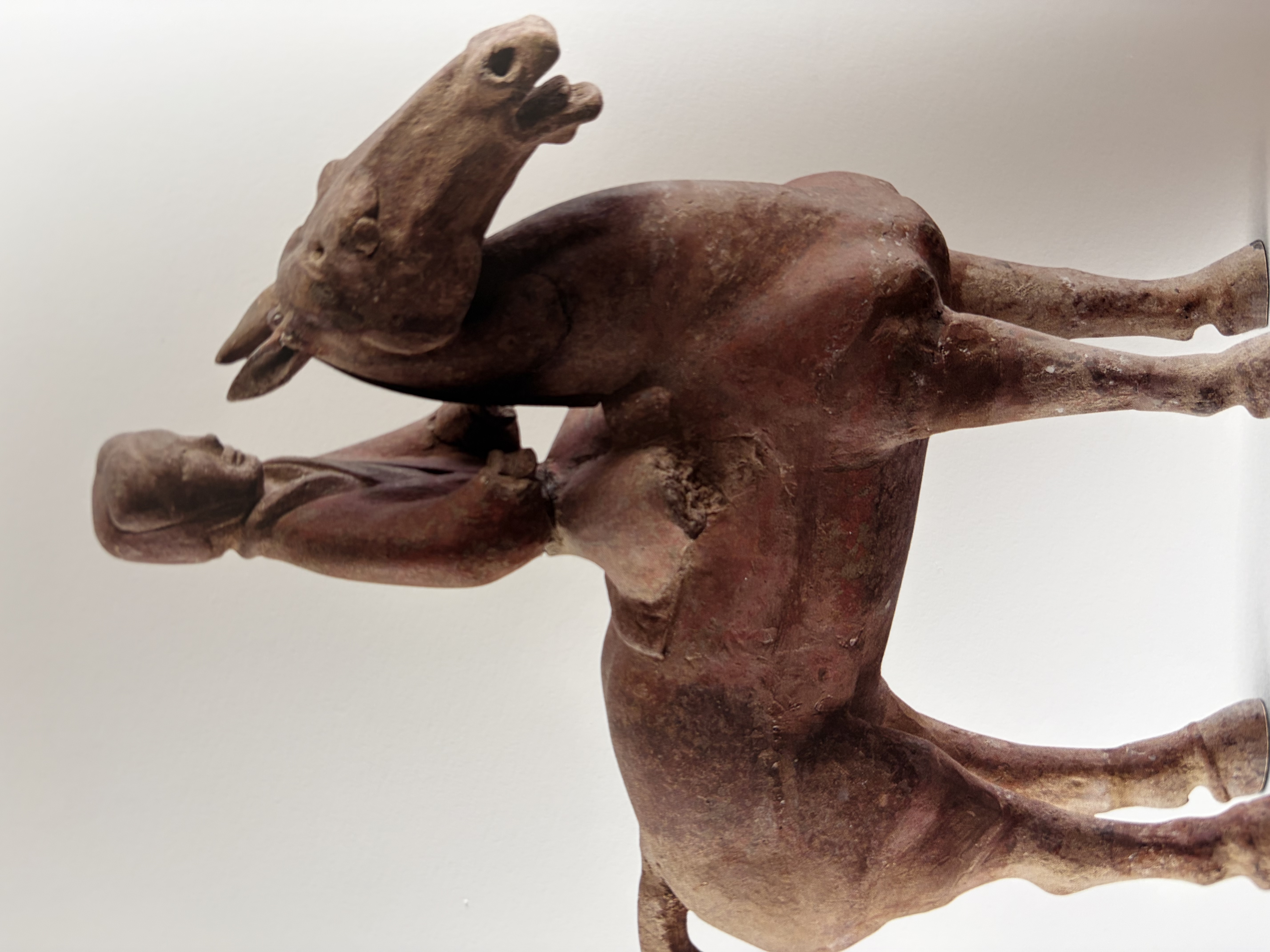 西域良马的传入,不仅改良了西汉马种,也影响了陶塑艺术。汉武帝茂陵的鎏金铜马,东汉的“马踏飞燕”,都带有明显的西域良马特征:高大修长,姿态奔放,神情张扬。与阳陵陶马的质朴内敛、木马的简洁务实,形成鲜明对比。汉武帝茂陵那匹鎏金铜马,体型匀称,修长,望之灵动矫健,当是典型的大宛马特质;“马踏飞燕”三足腾空,更表现出西域良马的灵动豪迈。