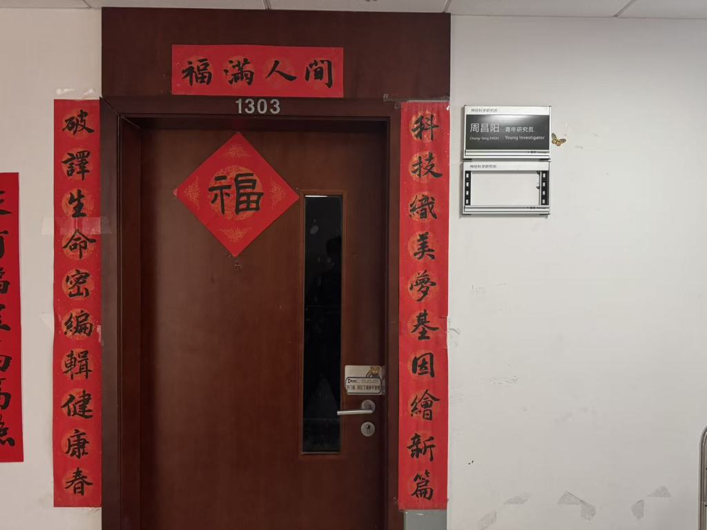 在周昌阳的办公室门外,研究组的小伙伴们贴上了福字和春联。上联写的是“科技织美梦基因绘新篇”,下联“破译生命密编辑健康春”,横批“福满人间”。这大概便是科研人的春节缩影,科研工作与年俗交织在一起。而那个春节期间家家都有的“福”字,对周昌阳团队来说还有另一层意思,便是造福人类的“福”。