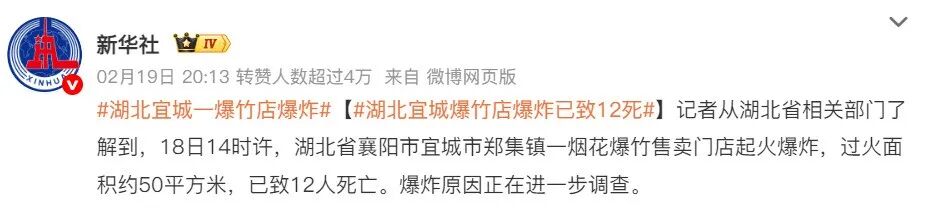 2026年2月18日14时许,湖北省襄阳市宜城市郑集镇一烟花爆竹售卖门店起火爆炸,过火面积约50平方米,已致12人死亡。爆炸原因正在进一步调查。