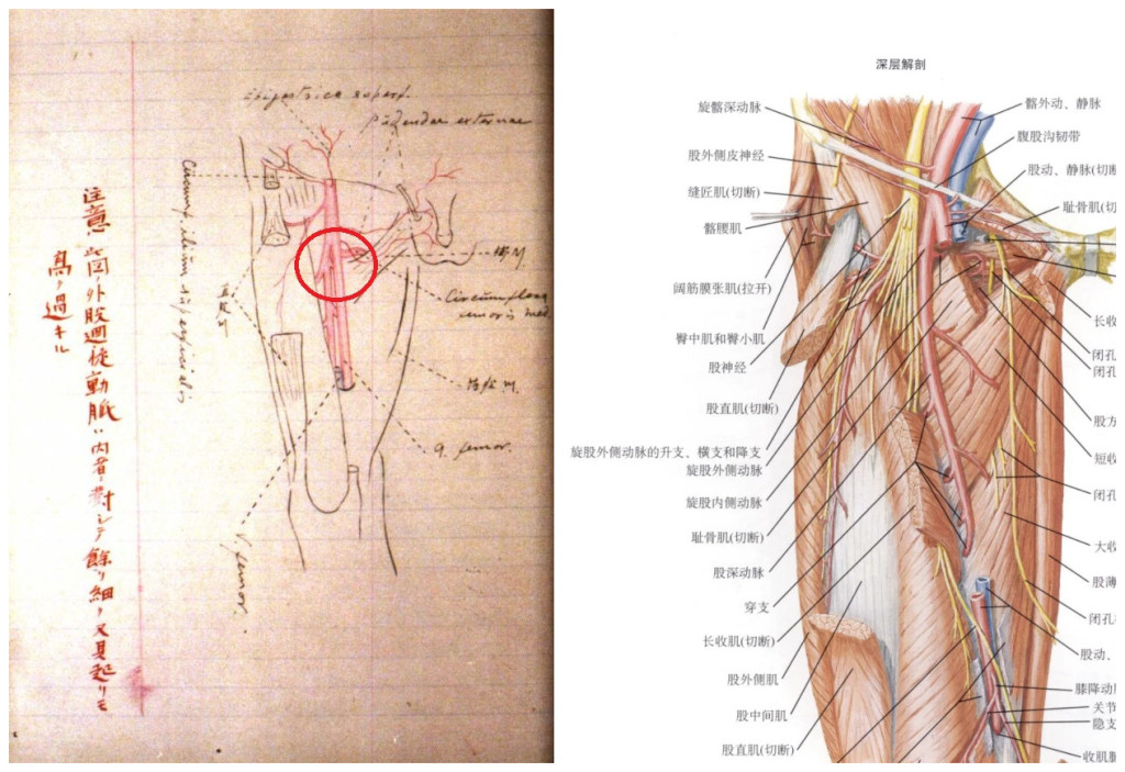 研究者们并没有找到小说中所谓对“下臂血管”的批改,比较相似的情况是一张血管学最后大腿前侧的动脉图,藤野批注道: