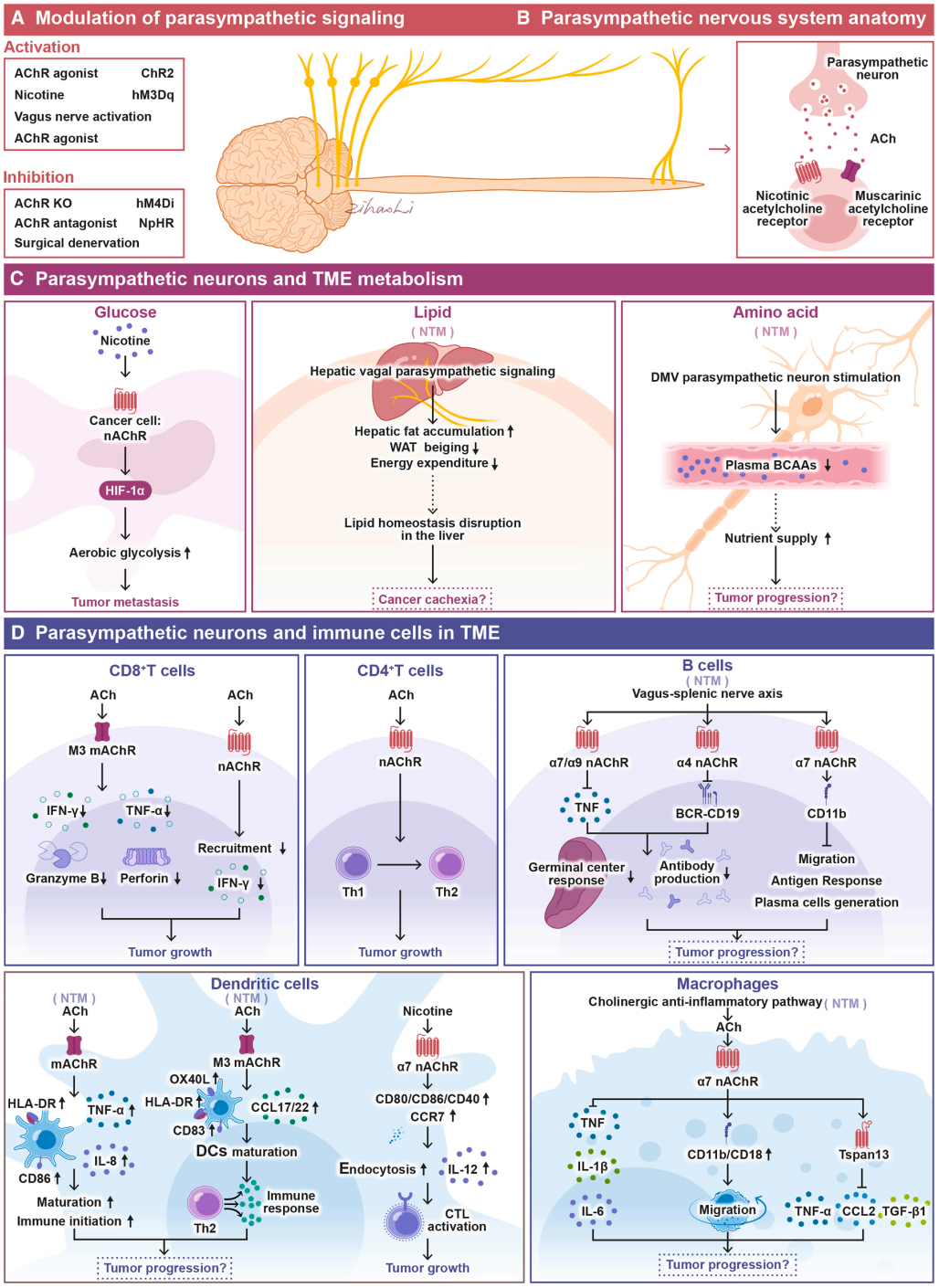 与交感神经常常“对抗”的副交感神经,在肿瘤中的作用更为复杂矛盾,既有研究显示其促癌,也有证据表明其可能抗癌。但可以肯定的是,它释放的乙酰胆碱同样能影响免疫细胞功能,是肿瘤微环境中不可忽视的调控因子。