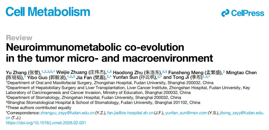2026 年 2 月 27 日,复旦大学附属中山医院樊嘉院士、季彤教授、孙云帆教授等(张誉、庄伟杰、朱浩东为第一作者),在 Cell 子刊 Cell Metabolism 上发表了题为:Neuroimmunometabolic co-evolution in the tumor micro- and macroenvironment 的综述论文。