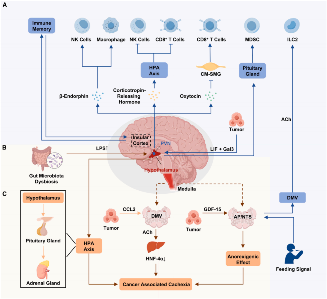许多晚期患者会出现严重的消瘦、乏力,即恶病质。这并非营养不够,而是肿瘤成功“劫持”了大脑的代谢中枢。肿瘤分泌的 GDF15 等因子,直接作用于脑干特定区域,强行抑制食欲。同时,它们还能引发脑部炎症,通过“迷走神经-肝脏轴”扰乱全身代谢,形成一个“越瘦越吃不下,代谢越乱肿瘤越长”的死亡循环。