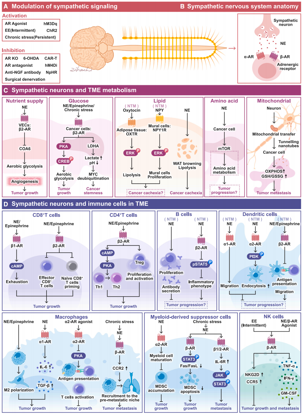 该综述全面概述了肿瘤微环境(TME)和肿瘤宏环境(TMaE)内的神经免疫代谢的协同进化。在 TME 尺度上,讨论了外周神经系统(PNS),包括交感神经、副交感神经和感觉神经元,在调控代谢过程和免疫细胞功能方面的作用。在 TMaE 尺度上,强调了癌细胞如何利用脑-体相互作用来重编程全身代谢和免疫反应,从而创造有利于肿瘤进展的条件。此外,该综述还描述了 PNS 如何作为肿瘤与远端器官之间长距离通信的通道。最后,该综述指出了关键的知识空白,提出了应对当前局限性的策略,并讨论了具有临床可行性的神经免疫和神经代谢疗法。