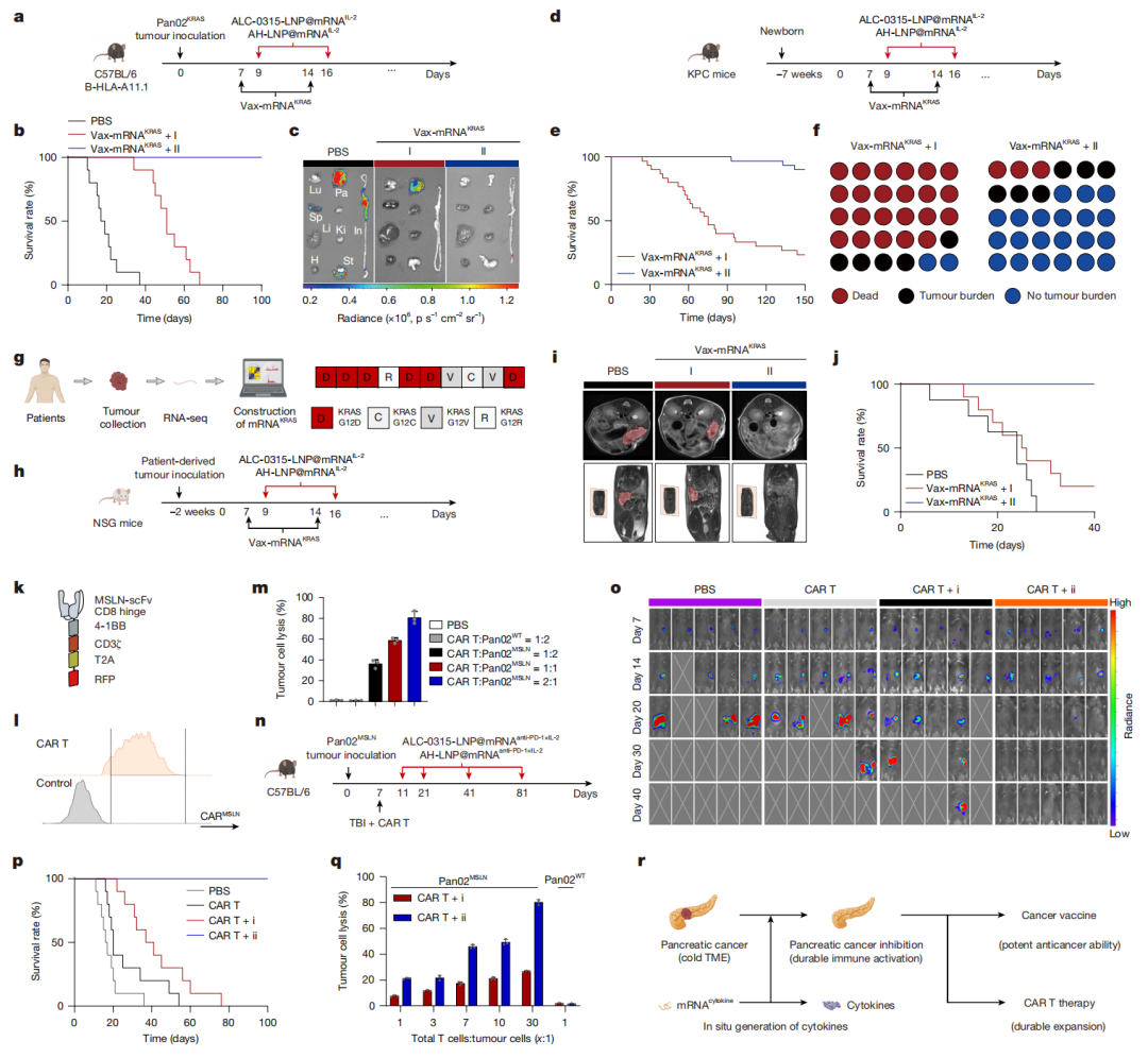 除了基因编辑外,研究团队还探索了 AH-LNP 在胰腺癌治疗中的应用。研究团队将编码治疗性免疫调控因子(IL-2)的 mRNA 通过 AH-LNP 递送到胰腺,并与癌症疫苗或 CAR-T 细胞疗法相联合使用。
