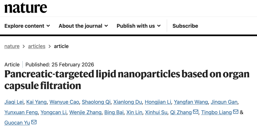 2026 年 2 月 25 日,清华大学喻国灿、浙江大学医学院附属第一医院梁廷波、章琦等人在国际顶尖学术期刊 Nature 上发表了题为:Pancreatic-targeted lipid nanoparticles based on organ capsule filtration 的研究论文。