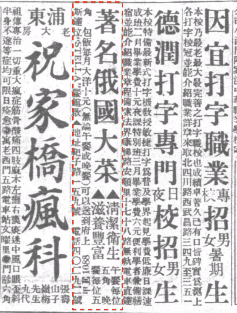 俄国大菜馆出现早期,除了霞飞路上的两家俄国大菜馆,1929年上海的虹口区也有一家生意不错的斯达拉Stella餐馆。在斯达拉吃饭按人头算,午餐和晚餐都是每位五角。餐馆更是创新地推出包饭套餐,无论午餐或晚餐,每月只需大洋10元就可以送到府上,堪称“外卖”业的先驱。