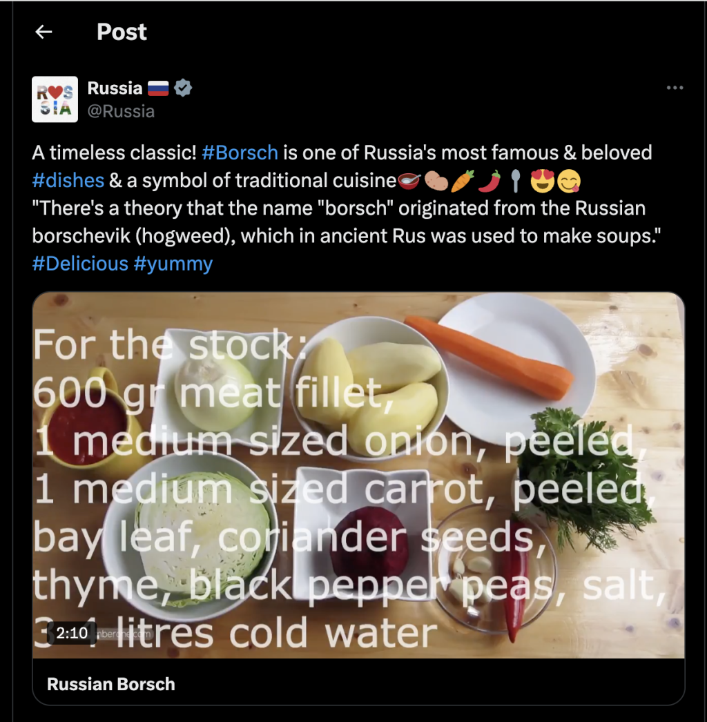 2019年5月39日,俄罗斯外交部官方社交媒体账号X发布红菜汤做法教学视频,配文“跨越时代的经典!红菜汤是俄罗斯最负盛名和最受欢迎的传统餐点。据传Borscht起源于俄语borschevik(hogweed),是因为俄国人用它来做汤”。推文中的做法与配料表接近于1946年华美给出的菜谱版本。但是它在煮牛肉汤时,锅内使用了包括洋葱、胡萝卜、月桂叶、芫荽籽、百里香、黑胡椒粒等更多的香料。熬煮红汤底的时候,以大量甜菜打底,加入了一罐番茄酱,欧芹、香菜等香料叶子。最后装盘时,表面装饰厚厚的酸奶油。这又与1936年周海婴在山东帮餐馆吃到的酸奶油一致。