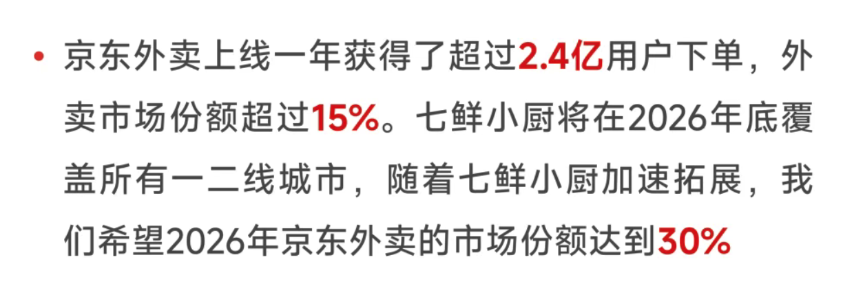 据最新发布的京东2025年第四季度及全年业绩财报数据显示,京东外卖上线一年获得了超过2.4亿用户下单,外卖市场份额超过15%。七鲜小厨将在2026年底覆盖所有一二线城市,随着七鲜小厨加速拓展,希望2026年京东外卖的市场份额达到30%。亮眼的财报数据背后,京东外卖所做的,或许可以归结为一句话:让所有人,都能更省心、更放心地吃上一口好饭。
