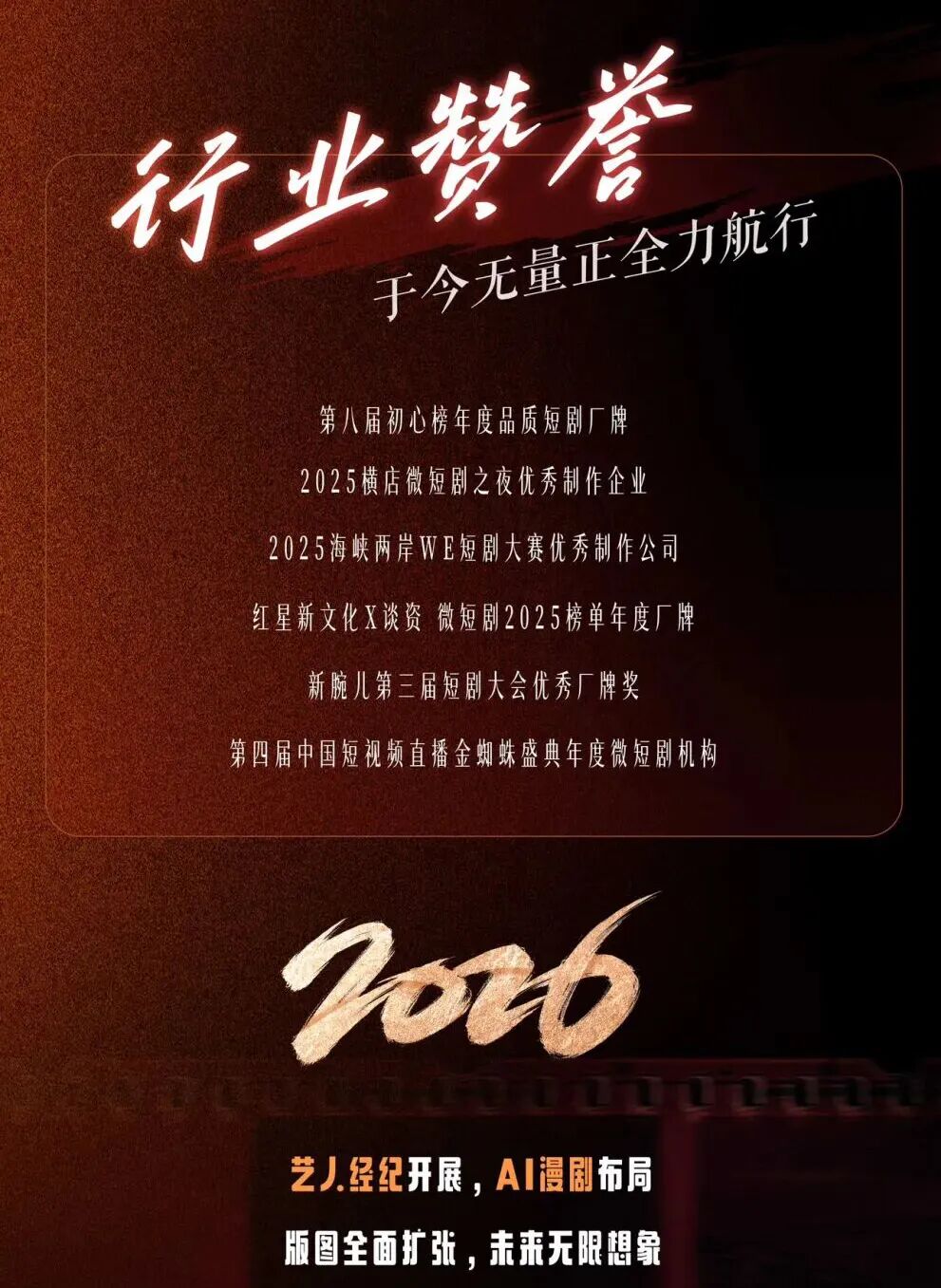 不过,公司迟迟没有布局艺人经纪,创始人李峻丞曾表示有遗憾。今年年初发布了演员招募。在于今无量的年度总结中,艺人经纪和AI漫剧将是他们2026重点发力的领域。