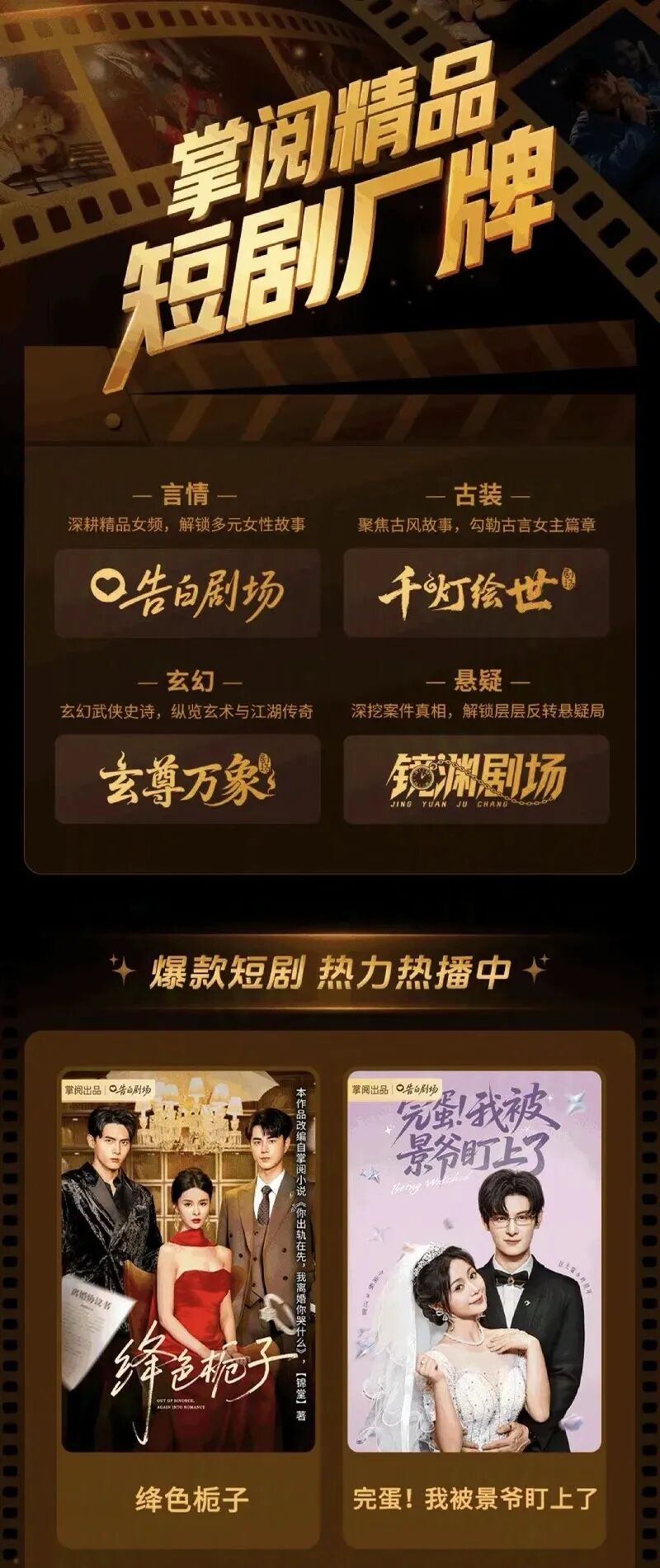 开发告白剧场(女频情感)、千灯绘世(古装权谋)、玄尊万象(玄幻武侠)、镜渊剧场(悬疑推理)四大厂牌矩阵,推出的《绛色栀子》上线24小时登顶红果热搜TOP3、全网话题破1亿;《贵嫡》在腾讯视频亦表现不俗。