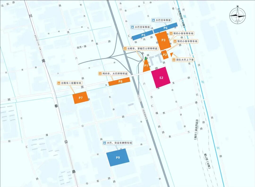 7.设置网约车即停即走点,保障临时上下客停车需求。在P8停车场内设置网约车即停即走点,步行至商务合作区联检大厅约5分钟。