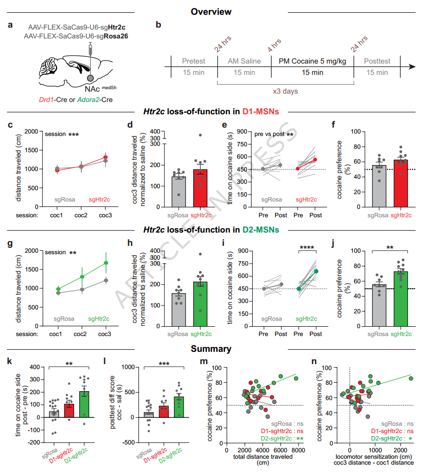研究者用CRISPR-Cas9技术,分别在D1和D2-MSNs里敲除了5HT2c受体,然后用条件性位置偏爱实验,看小鼠对可卡因的反应。