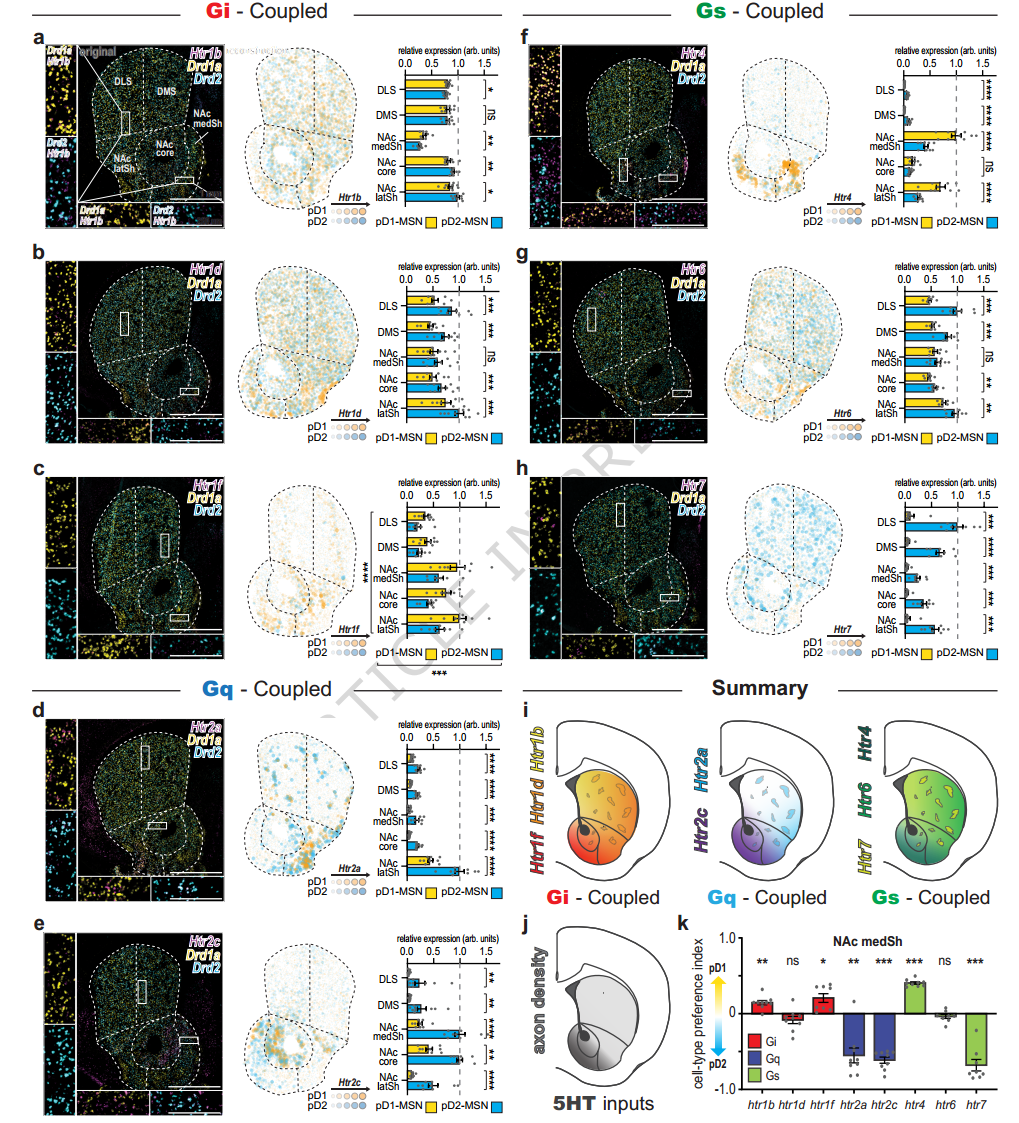 D1-MSNs:富集Gi偶联的Htr1f和Gs偶联的Htr4——血清素对它们的作用相对平衡,有抑制也有激活;D2-MSNs:高度富集Gq偶联的5HT2a、5HT2c和Gs偶联的Htr7。