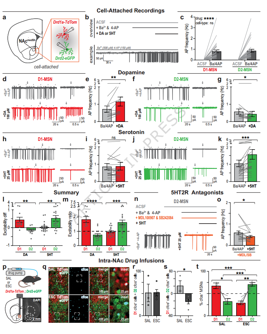 用急性脑片电生理记录,直接检测D1和D2-MSNs对多巴胺和血清素的反应,结果显示,多巴胺激活D1-MSNs,抑制D2-MSNs;血清素对D1-MSNs没什么作用,显著激活D2-MSNs。而且血清素的兴奋效应,可以被5HT2a/2c受体拮抗剂阻断。