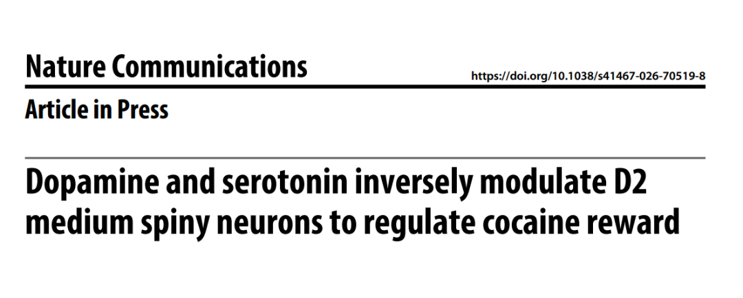 2026年3月14日,斯坦福大学Robert Malenka团队和哈佛大学Daniel Cardozo Pinto团队在《Nature Communications》上发表的研究《Dopamine and serotonin inversely modulate D2 medium spiny neurons to regulate cocaine reward》,第一次清晰揭示了两者的互相制衡: