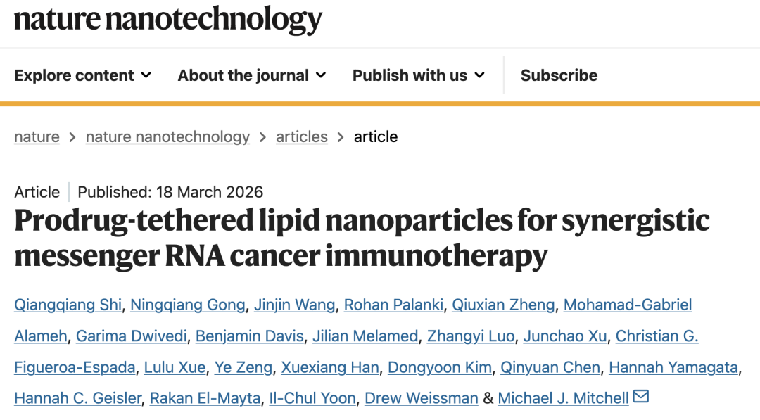2026 年 3 月 18 日,宾夕法尼亚大学 Michael J. Mitchell 团队(宾夕法尼亚大学石强强、中国科学技术大学宫宁强研究员为论文共同第一作者)在 Nature Nanotechnology 期刊发表了题为:Prodrug-tethered lipid nanoparticles for synergistic messenger RNA cancer immunotherapy 的研究论文。