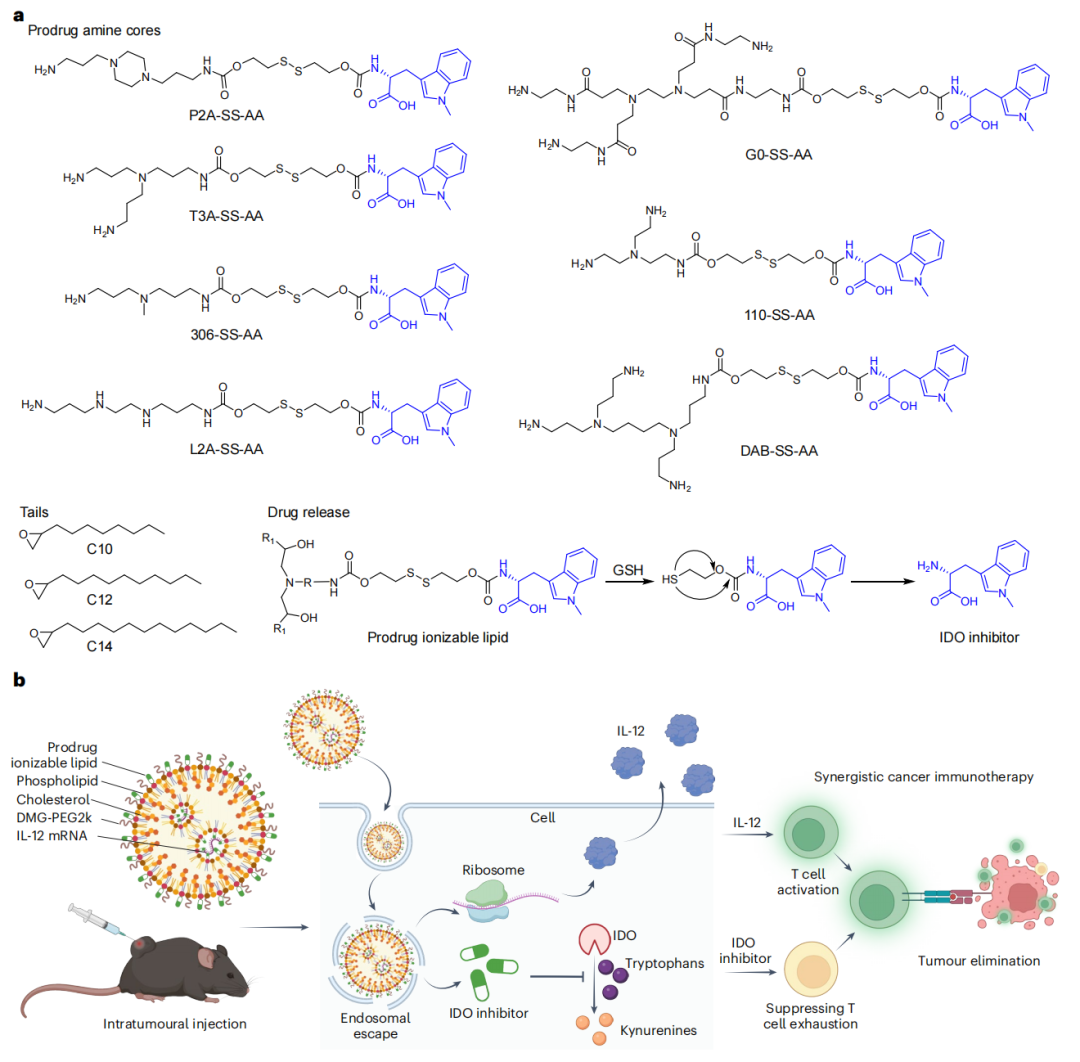 该研究设计了一种前药可电离脂质纳米颗粒(pLNP),在可电离脂质中结合了可在细胞内被裂解的 IDO 抑制剂,同时封装了 IL-12 mRNA,从而实现了激活 T 细胞和抑制其耗竭。