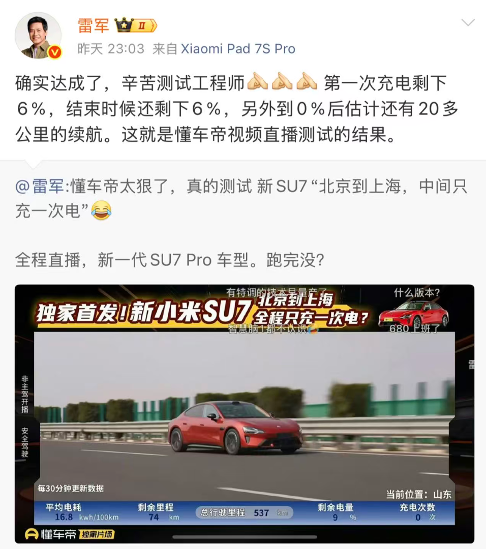 原标题:《新SU7北京到上海全程只充一次电?雷军转发懂车帝实测:确实达成了》