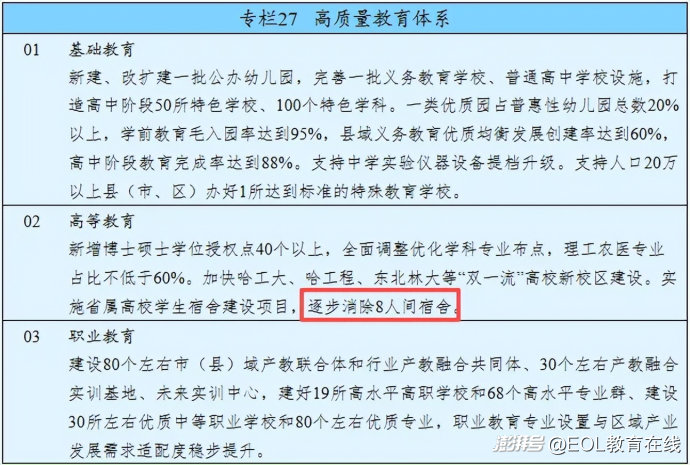 近日,黑龙江省人民政府印发《黑龙江省国民经济和社会发展第十五个五年规划纲要》。其中提到:“实施省属高校学生宿舍建设项目,逐步消除8人间宿舍。”