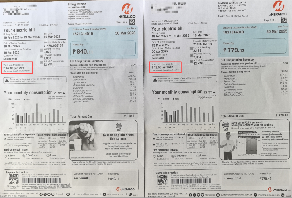 在亚洲气候行动者(菲律宾)担任总干事的王晓军告诉澎湃新闻,他刚拿到这个月的电费单:今年3月与去年同期的用电量正好都是62千瓦时,但电费已从779比索(约合人民币89.5元)涨至840比索(约合人民币96.5元)。随着下周复活节假期临近,他预计今年菲律宾返乡人数可能明显减少,因为柴油和汽油价格自3月初以来涨幅明显,而且未来还可能出现供应短缺。