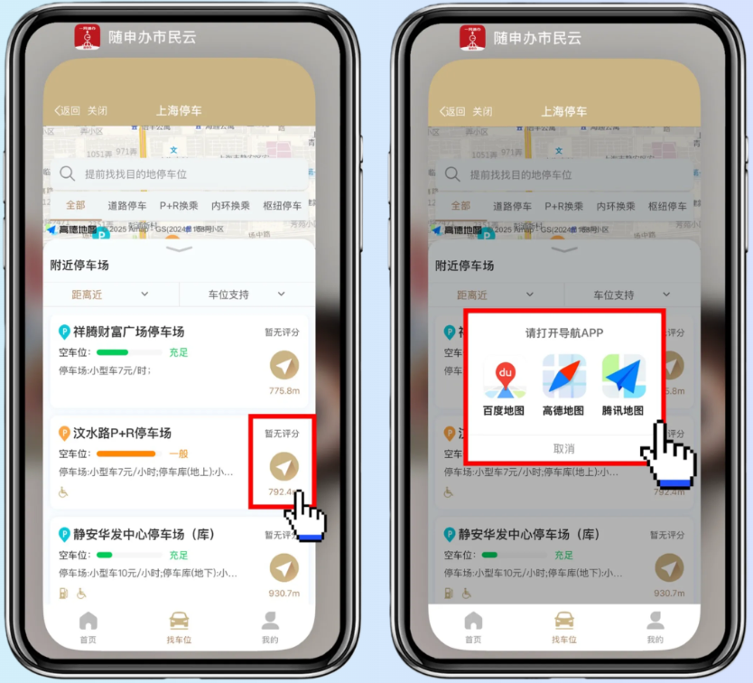 在“上海停车”挑选好您想前往的停车场,并点击“导航”选项,您可以选择您偏好的导航应用,比如百度地图、高德地图或腾讯地图等。