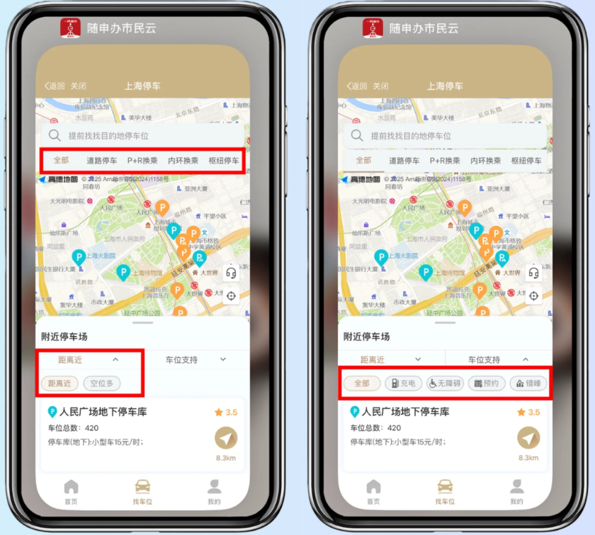 选场所:“道路停车”“P+R换乘”“内环换乘”“枢纽停车”四种场所自由切换,怎么方便怎么来!