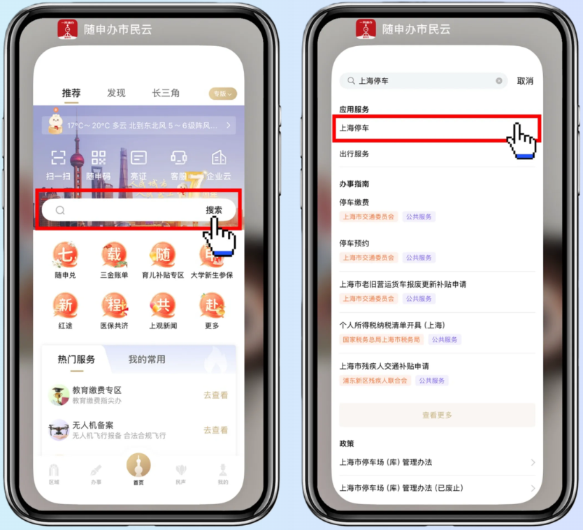 打开“随申办市民云”APP,首页搜索栏输入“上海停车”,并点击进入。