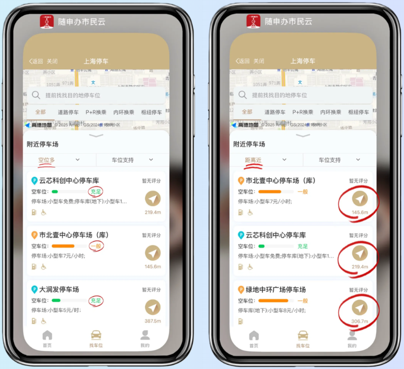 选就近:“距离近”或“空位多”任选,筛选符合您自身要求的停车场。