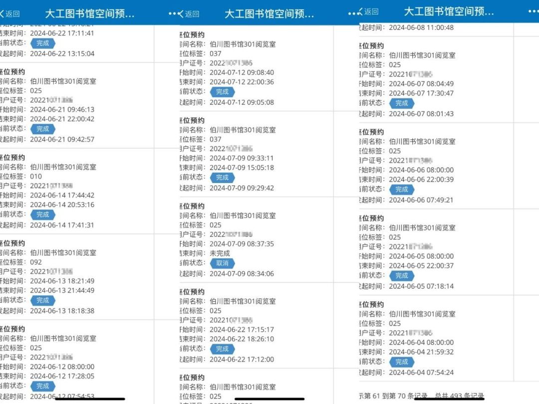 就这样,汤羽喆成了教室前排的“钉子户”,把每一堂课都听好学好。她每天迎着清晨六点的微光而起,伴着晚上十点闪烁的星光而归,无论什么恶劣天气都阻止不了她去图书馆的脚步,风雨无阻,锲而不舍。打开她的图书馆预约界面,密密麻麻的493条预约记录后跟着的是蓝色的“完成”标志,伯川图书馆301阅览室是她最常去的地方。