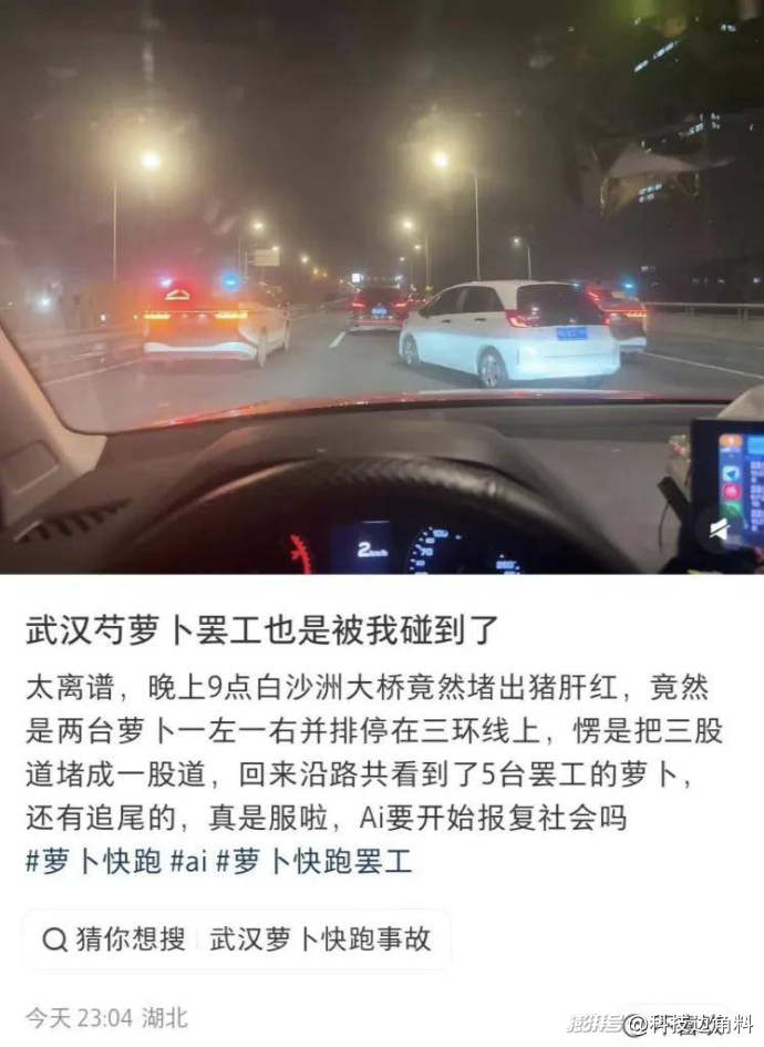 3月31日晚9时许,武汉三环线、二环线等城市主干道上演科幻惊悚一幕:上百台百度“萝卜快跑”自动驾驶出租车,在晚高峰车流中突然集体锁死、停滞路中,车灯双闪,如同被按下“暂停键”的钢铁僵尸,瞬间瘫痪半座城。