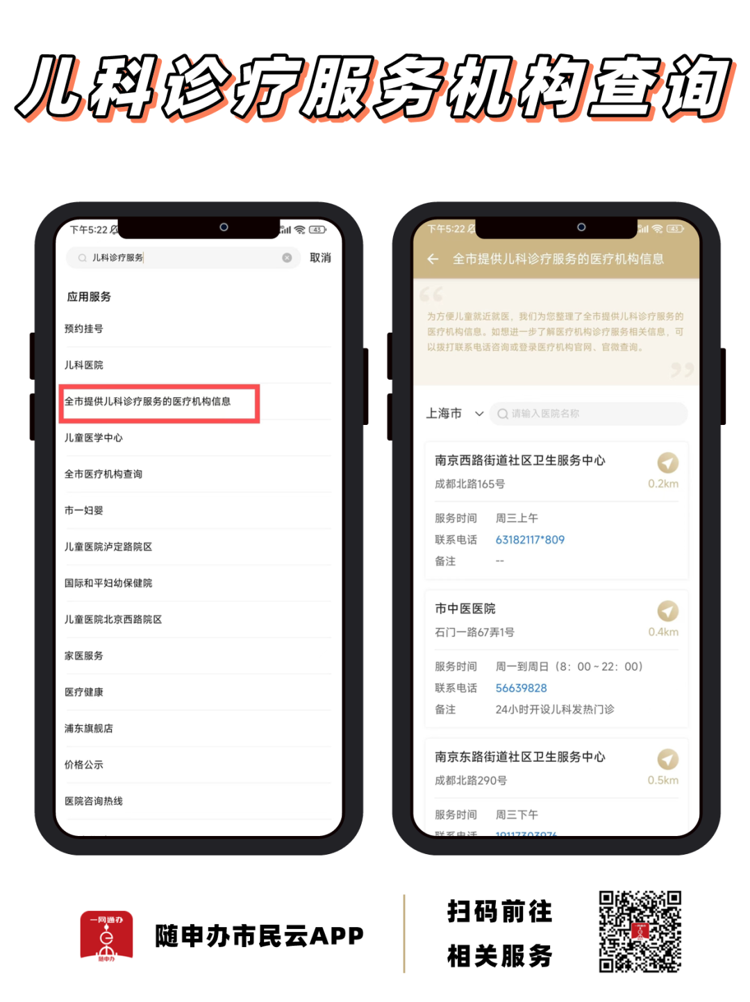 “随申办市民云”APP【儿科服务查询】,可线上查全市提供儿科诊疗服务的医疗机构。扫描下方二维码即可直达服务。