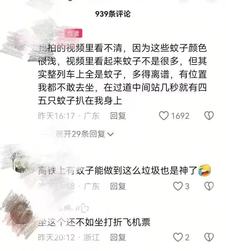 3月31日,有多名网友在社交平台发帖称:当天下午从香港西九龙发车的G386次高铁列车车厢内,出现大量蚊虫,严重影响了乘车体验。
