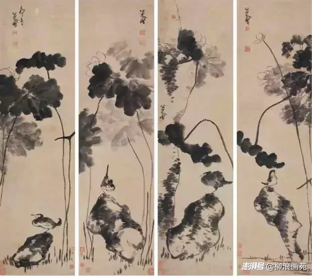 八大山人的简,根基是深不可测的强悍功力,绝非无源之水、无本之木。他出身明朝宗室,自幼浸淫诗书笔墨,家学渊源深厚,年少便精通书画,篆隶楷行诸体皆妙,将书法笔意融入绘画,练就了“笔简形具,形神兼备”的绝世功底。他笔下的线条,藏锋蓄力、绵里裹铁,如屋漏痕、折钗股,看似随意寥寥数笔,却力透纸背、苍劲圆融,一笔下去,物象的风骨、神韵、性情尽数尽显。画荷,无需满池碧叶,只一茎瘦梗、半片残荷,便写出荷的清傲孤绝;画鸟,不必羽翼繁复,只极简轮廓、一点白眼,便藏尽桀骜不驯的生命力;画石,不做精细皴擦,只淡墨几笔、枯笔勾勒,便显山石的苍古雄浑。这种“以少少许胜多多许”的极简,是他穷尽半生笔墨修行,删繁就简、去芜存菁的结果,是把万千技法熔于一炉,再化繁为简的通透,没有数十年的笔墨深耕、功力积淀,绝无可能做到这般举重若轻。