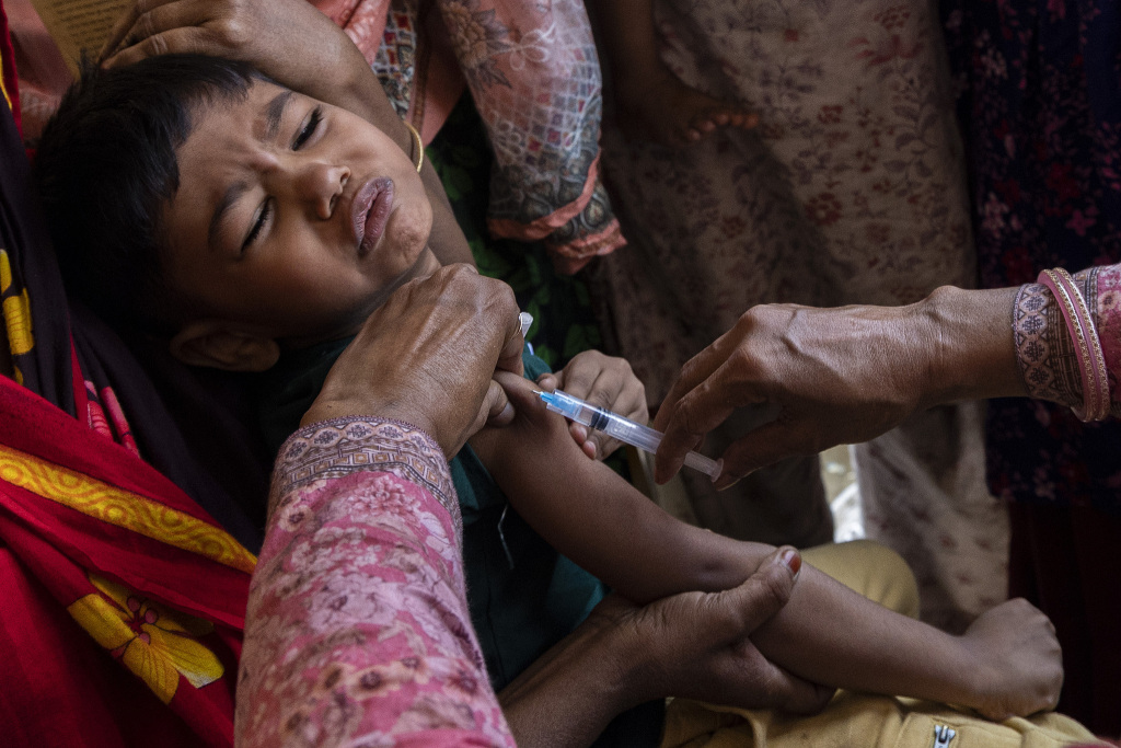 当地时间2026年4月12日,孟加拉国达卡,一名儿童在麻疹疫情暴发后紧急接种疫苗。视觉中国 图