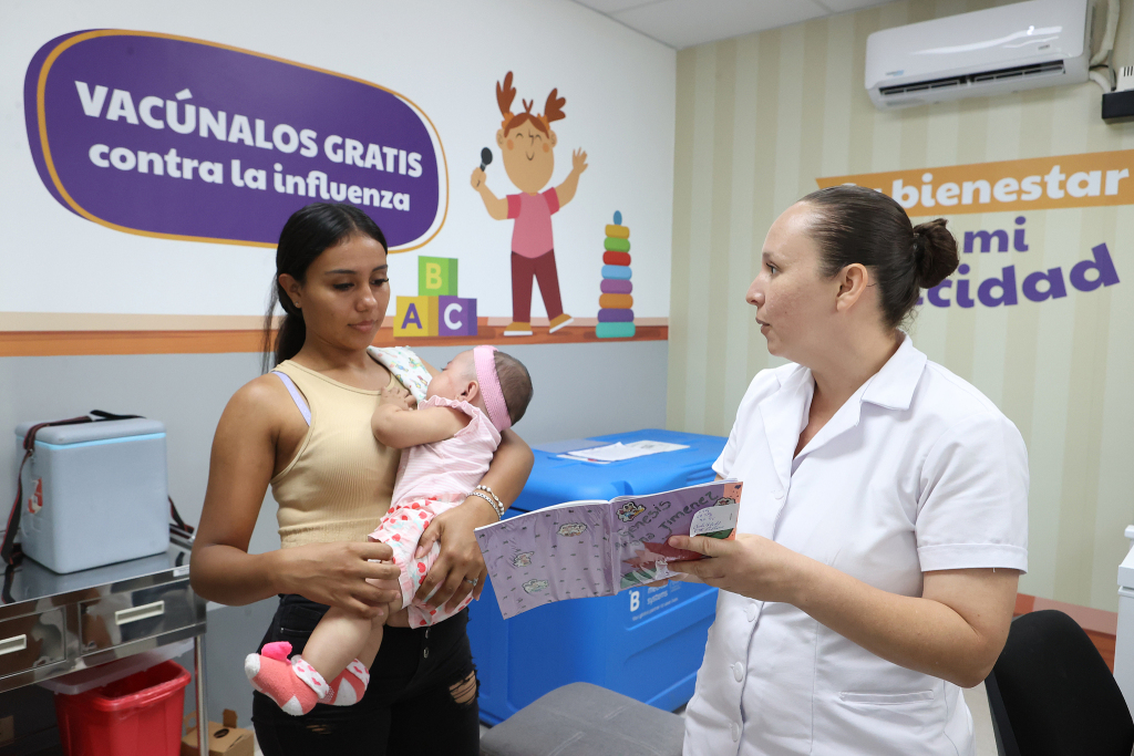 当地时间2026年4月10日,萨尔瓦多内哈帕,一名护士在公共卫生中心的麻疹疫苗接种活动中与一名母亲交流。视觉中国 图