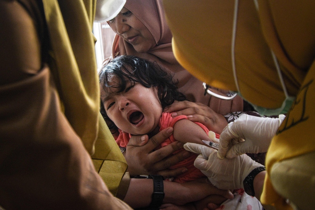 当地时间2026年4月6日,印度尼西亚西爪哇芝库库克,一名儿童在综合社区卫生所接种麻疹风疹疫苗。视觉中国 图
