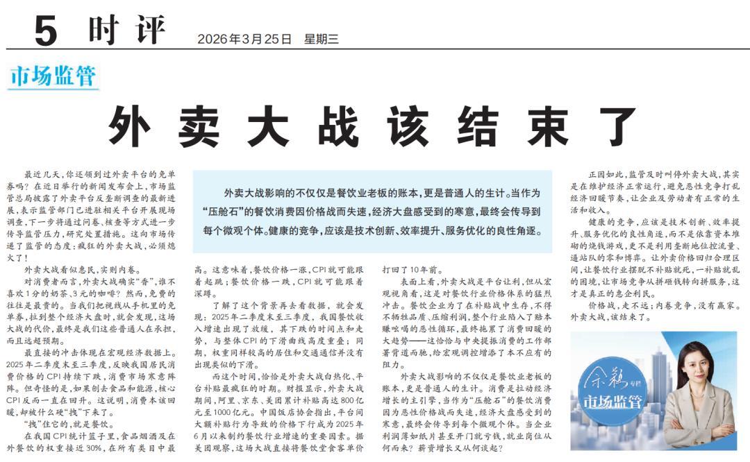 就在美团年度业绩披露前一日,国家市场监管总局网站转发《经济日报》文章,定调“外卖大战该结束了”,释放出将强力介入外卖大战的信号。