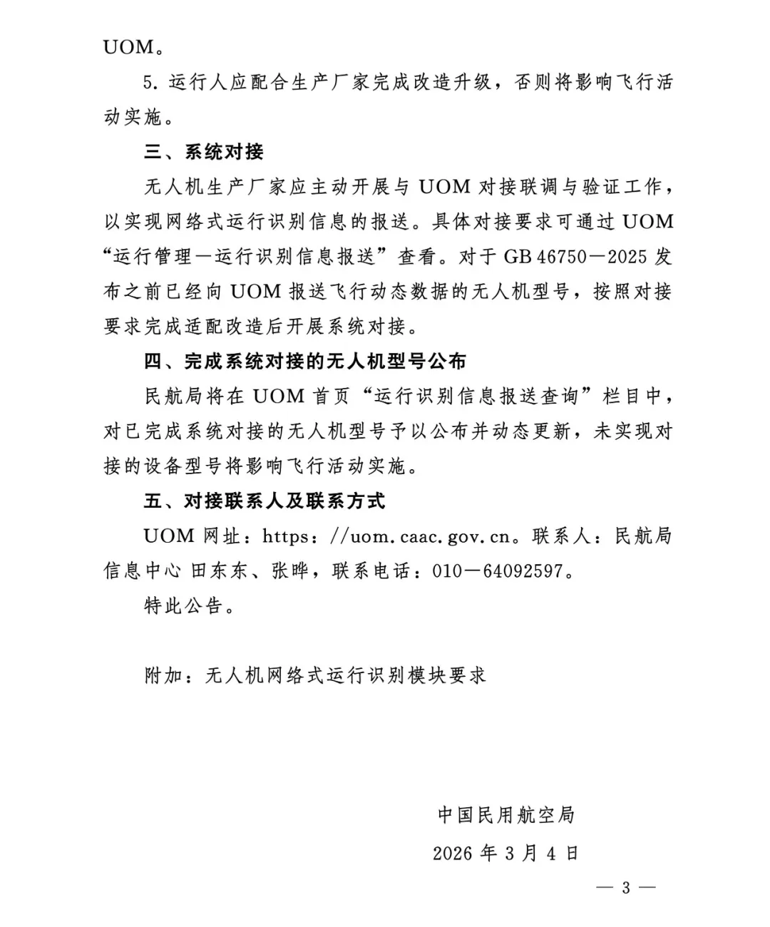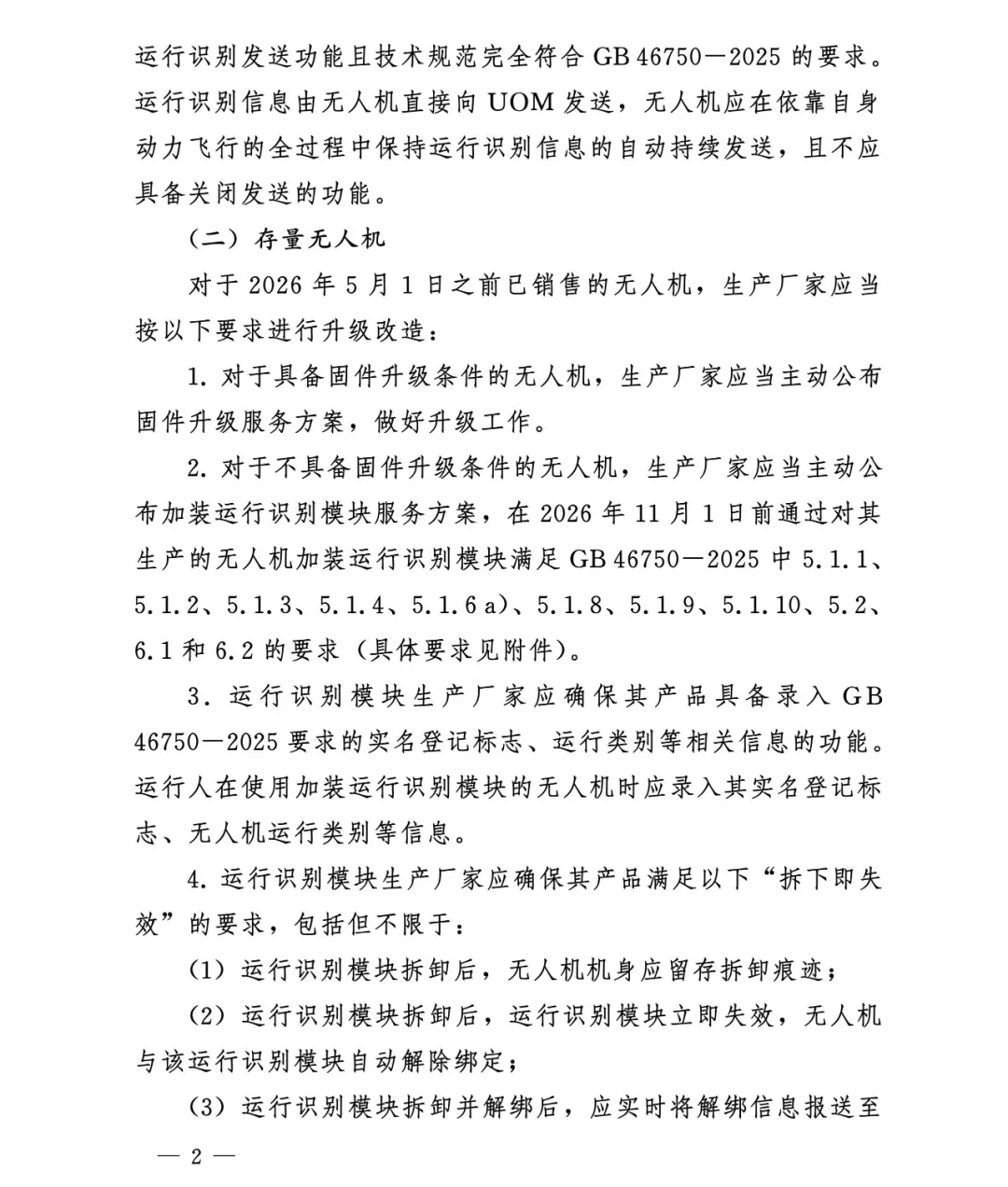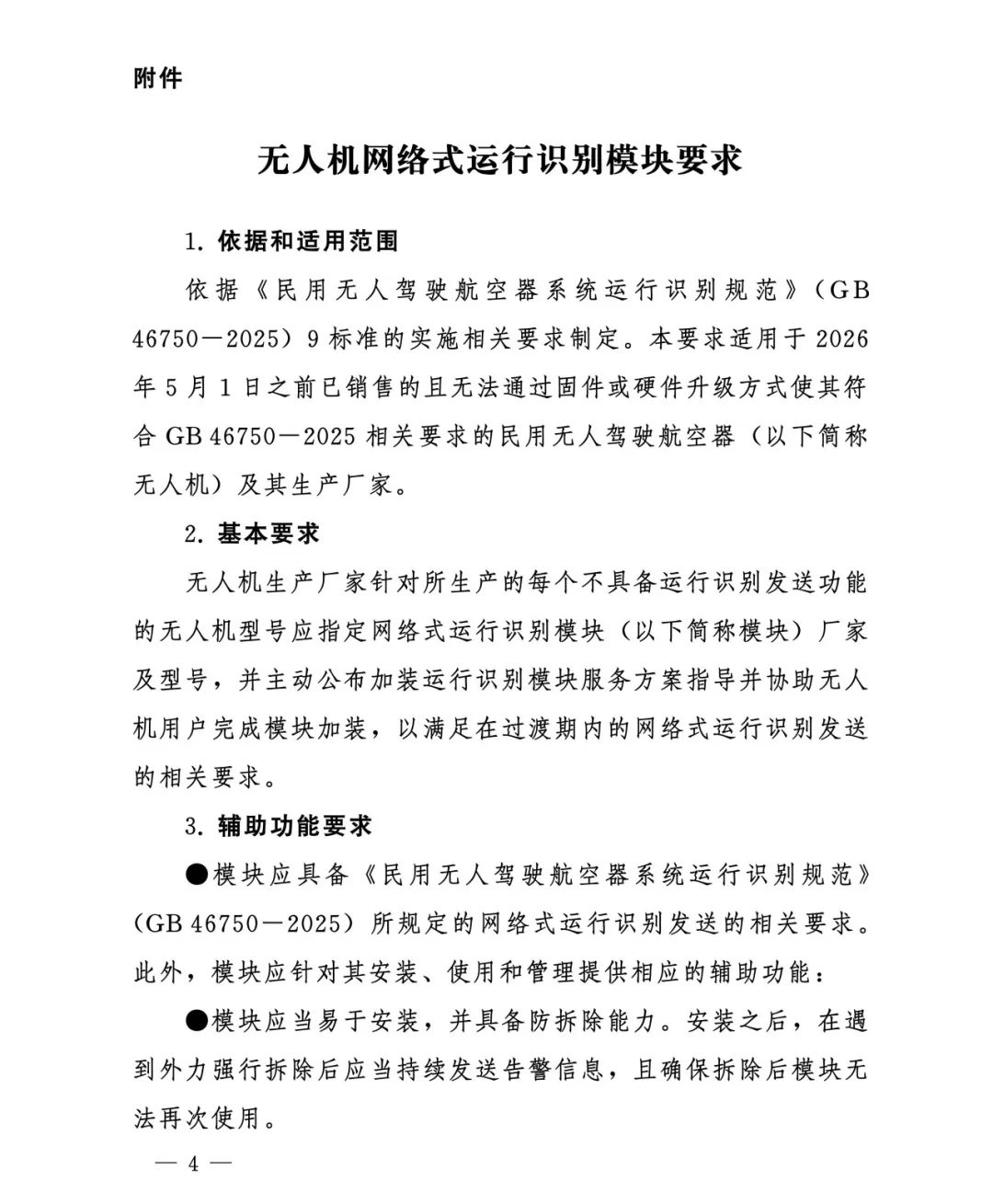 2.运行识别规范(解决“谁在飞、在哪飞”)-双轨识别。强制同时具备广播式(对外广播)和网络式(直连UOM平台)识别能力。